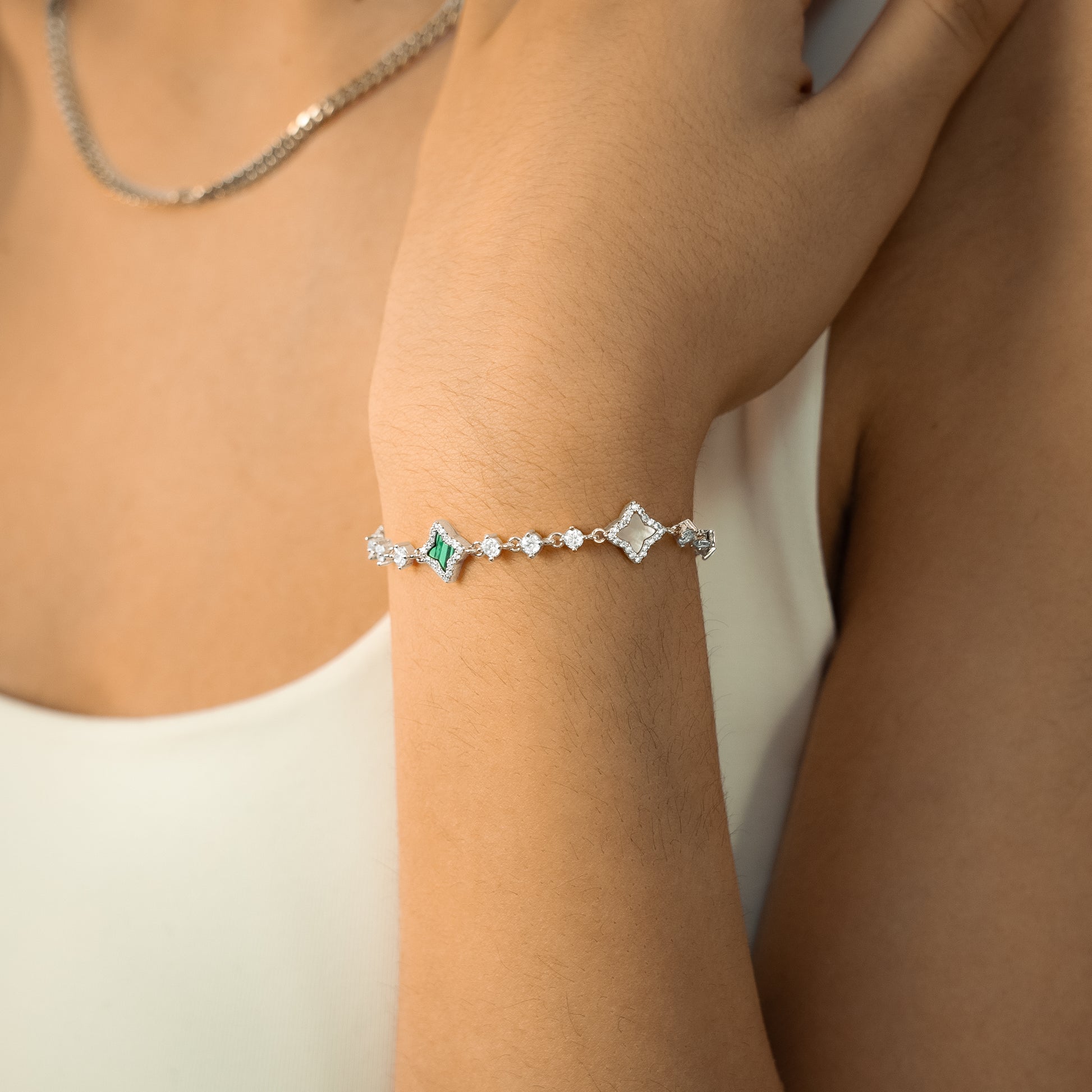 Découvrez notre Bracelet Flower Tennis, une pièce exquise qui marie l'élégance intemporelle du bracelet tennis et la délicatesse des fleurs. Chacune des fleurs, ornée d'une pierre imitation nacre ou malachite et d'une épaisseur de 8 mm, ajoute une touche de charme et de sophistication à ce bracelet de 3 mm.