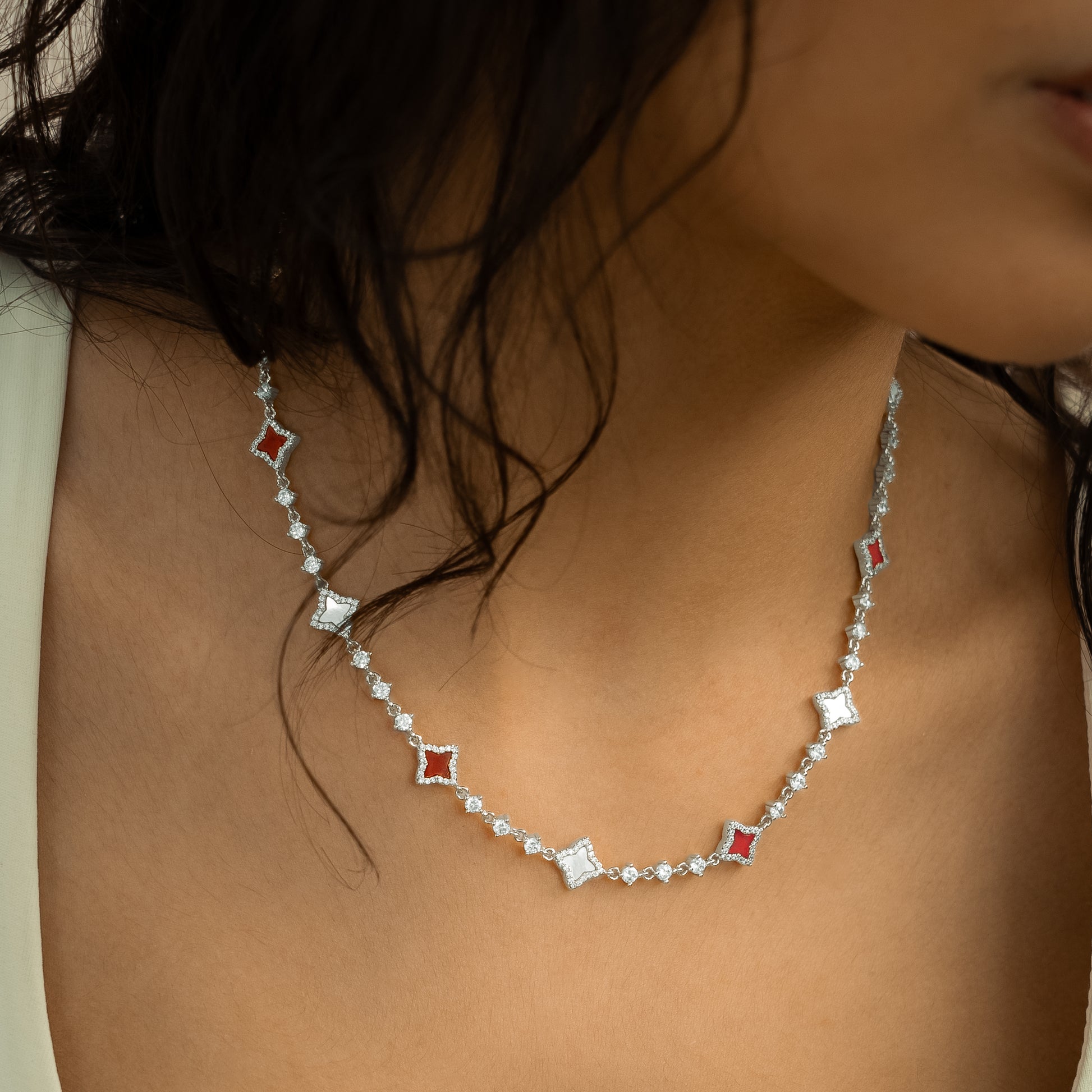 Découvrez notre Chaîne Flower Tennis, une pièce exquise qui marie l'élégance intemporelle de la chaîne tennis et la délicatesse des fleurs. Chacune des fleurs, ornée d'une pierre imitation nacre ou cornaline et d'une épaisseur de 8 mm, ajoute une touche de charme et de sophistication à cette chaîne de 3 mm.