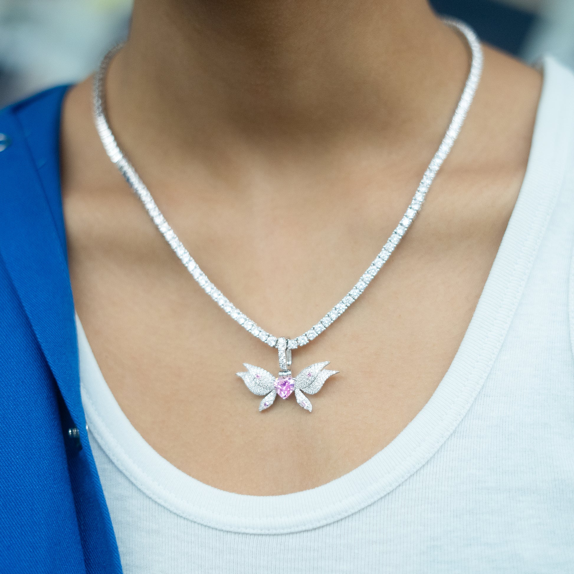 Découvrez notre pendentif exclusif Pixie Heart, une création unique en collaboration avec Candice, symbolisant la féminité et le charme intemporel. Au centre, une pierre rose en forme de cœur rayonne avec douceur, entourée de délicates ailes ornées d’oxydes de zirconium étincelants. Les touches de rose sur les ailes, en zirconium taillé en forme baguette, ajoutent une note subtile et sophistiquée au bijou.