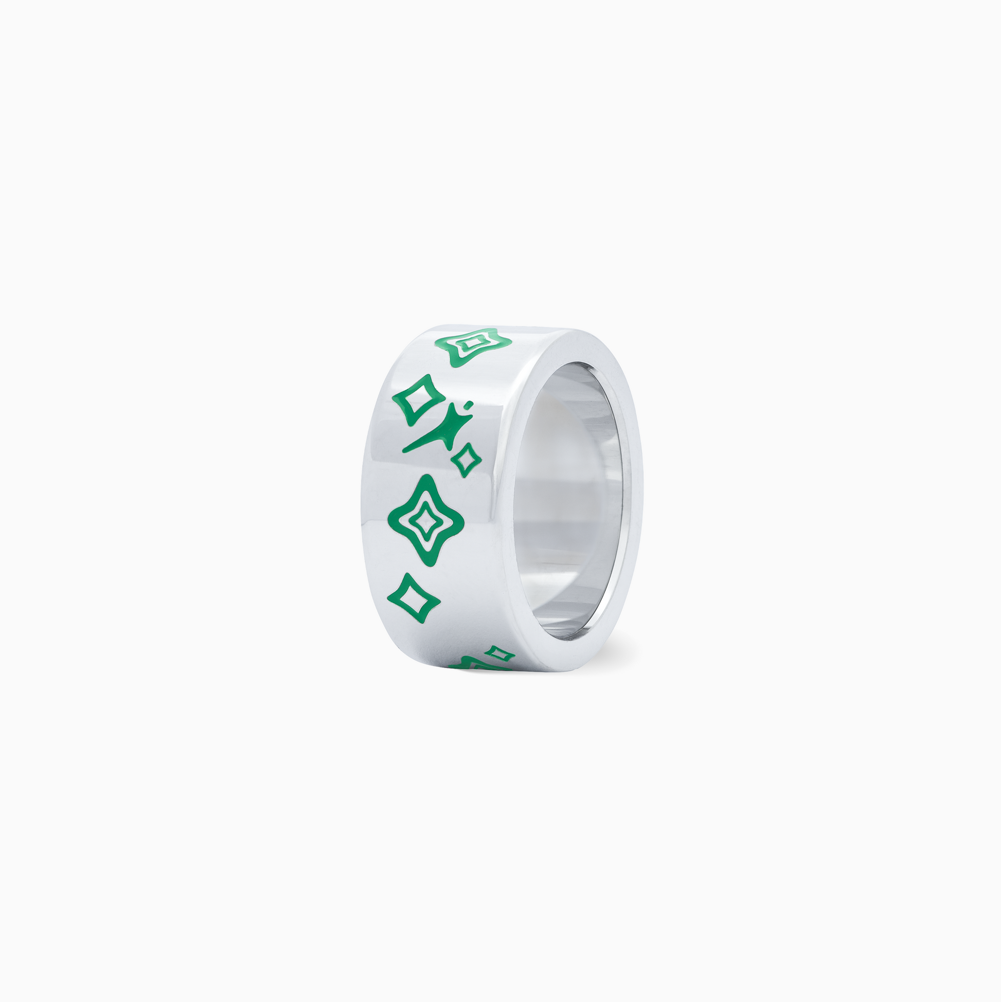 Discover the Stars & Flowers Band ring , a distinctive 10mm wide piece. Adorned with green enamel floral and star motifs, this ring combines elegance and originality.