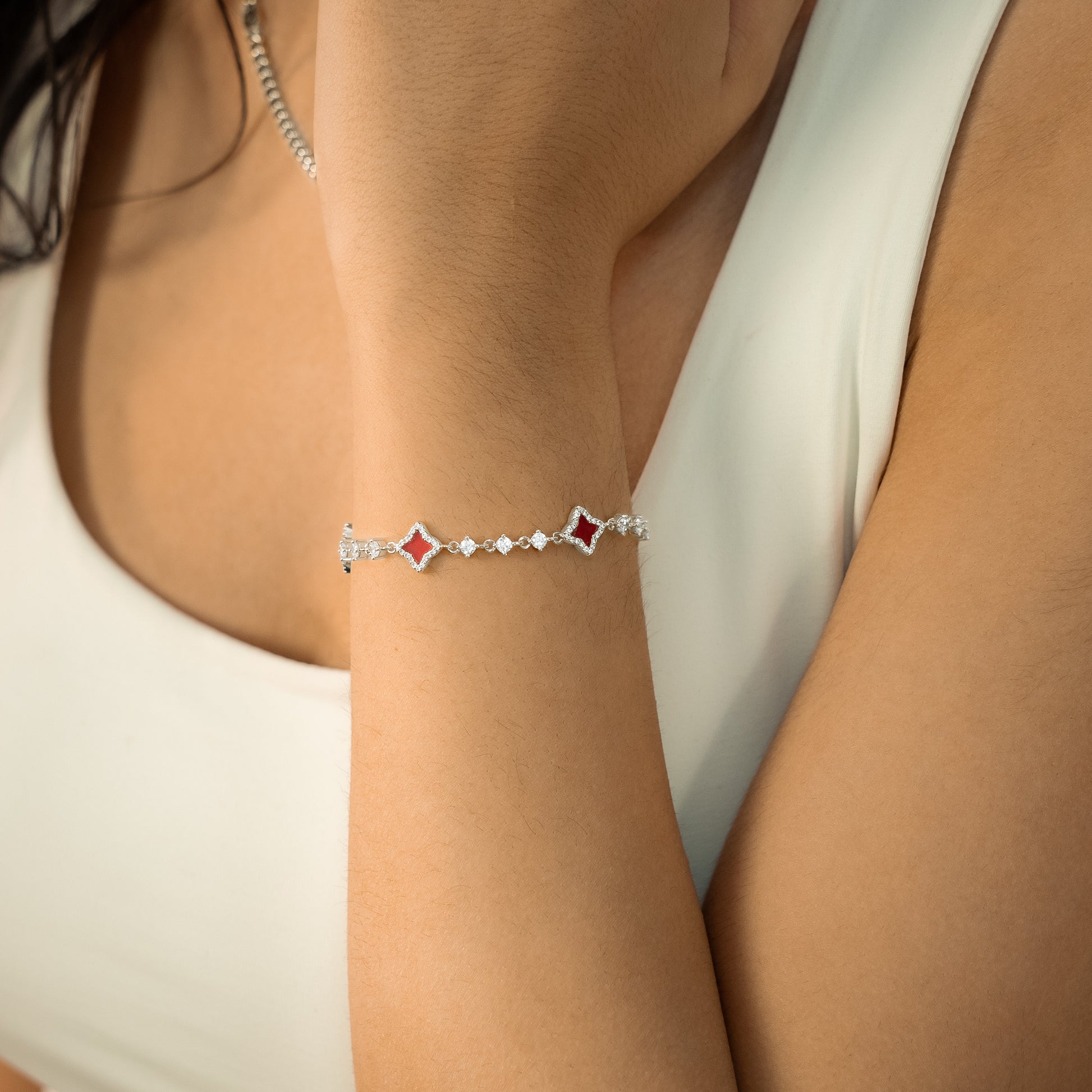 Discover our Flower Tennis Bracelet, an exquisite piece that combines the timeless elegance of the tennis bracelet and the delicacy of flowers. Each of the flowers, decorated with an imitation carnelian stone and measuring 8 mm thick, adds a touch of charm and sophistication to this 3 mm bracelet.