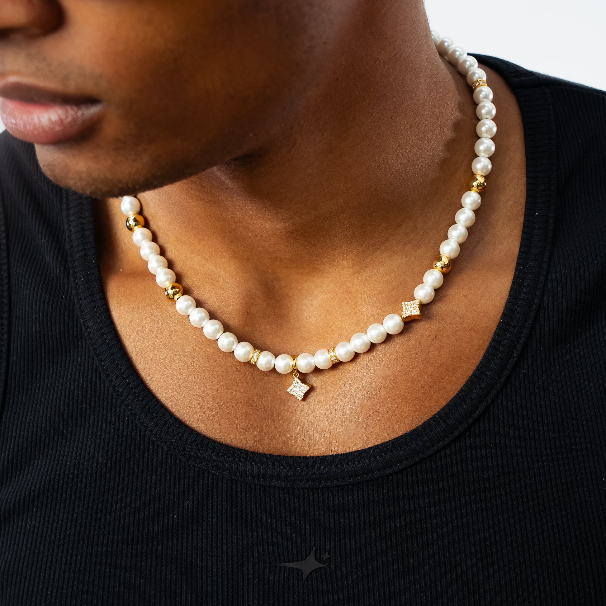 Discover our Flower Pearl chain , a refined piece that combines the softness of pearls with the brilliance of floral details. Adorned with 8 mm white pearls, punctuated with a few golden beads, this chain is distinguished by three sparkling flowers encrusted with white stones. One of them, suspended as a pendant, enhances the whole with an airy and luminous touch.