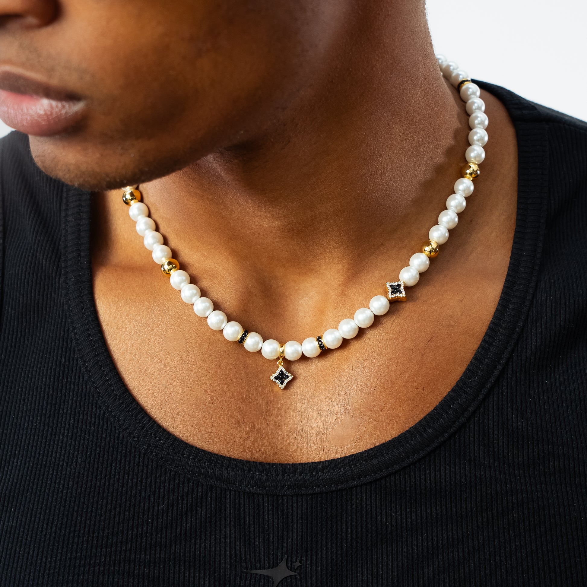 Discover our Flower Pearl chain , a refined piece that combines the softness of pearls with the brilliance of floral details. Adorned with 8 mm white pearls, punctuated by a few golden beads, this chain is distinguished by three sparkling flowers encrusted with black stones. One of them, suspended as a pendant, enhances the whole with an airy and luminous touch.