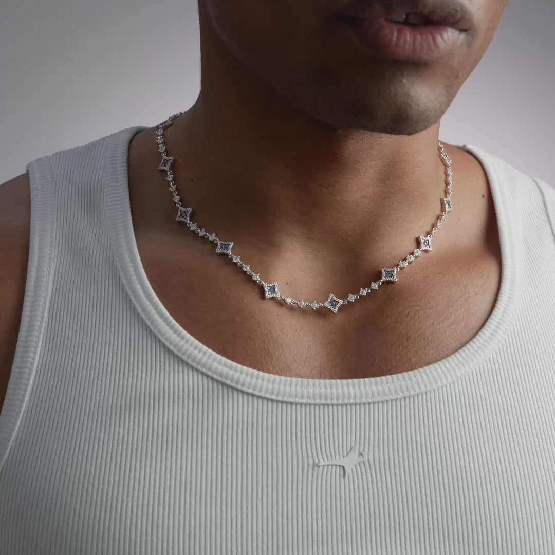 Discover our Flower Tennis Chain, an exquisite piece that combines the timeless elegance of the tennis chain with the delicacy of flowers. Each of the flowers, adorned with sparkling purple stones and measuring 8 mm thick, adds a touch of charm and sophistication to this 3 mm chain.