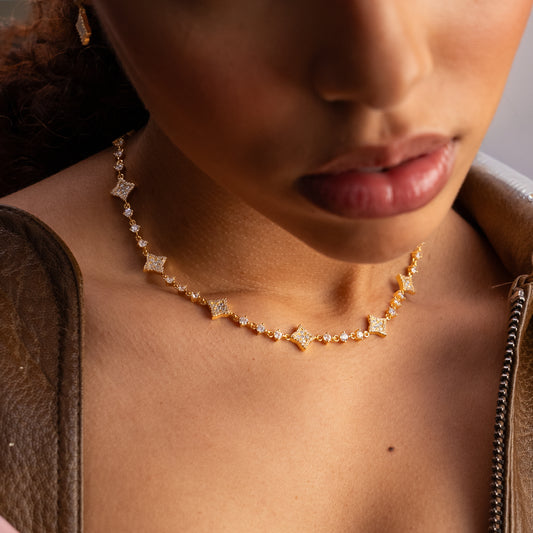 Gold-finish metal and cubic zirconia