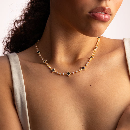 Here is our Flower pendant, combining delicacy and timeless refinement. At the heart of this jewel, a flower encrusted with sparkling stones highlights a central stone in imitation onyx, offering a thickness of 8 mm for a subtle and luminous charm.