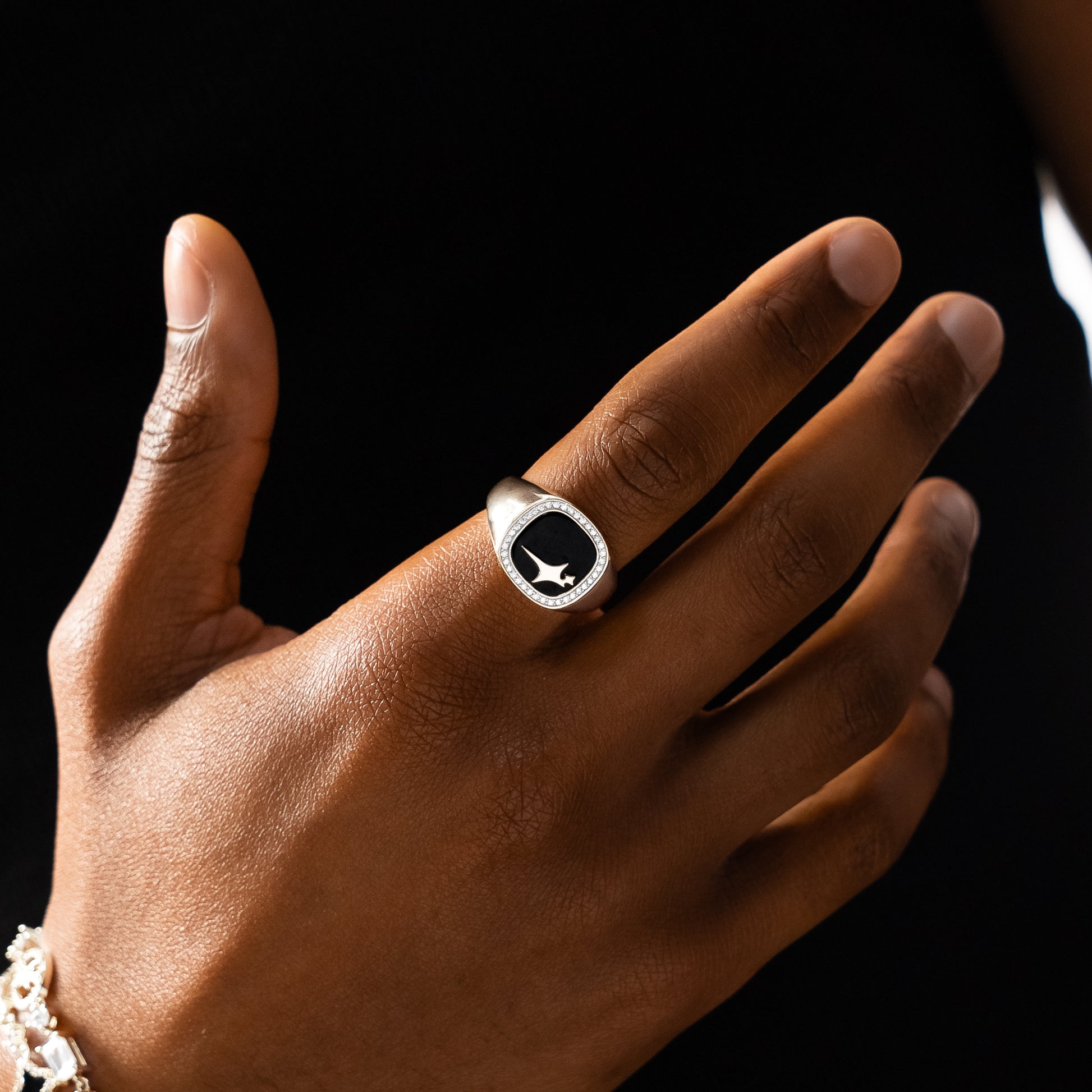 Discover our Raw Ring , a signet ring with a bold and refined design, highlighted by a large 15 mm square plate. Its center, adorned with an imitation onyx stone, contrasts delicately with the embossed Make it Shine logo. The whole is delicately encircled with white zirconium oxides, bringing a discreet but sophisticated touch of sparkle.