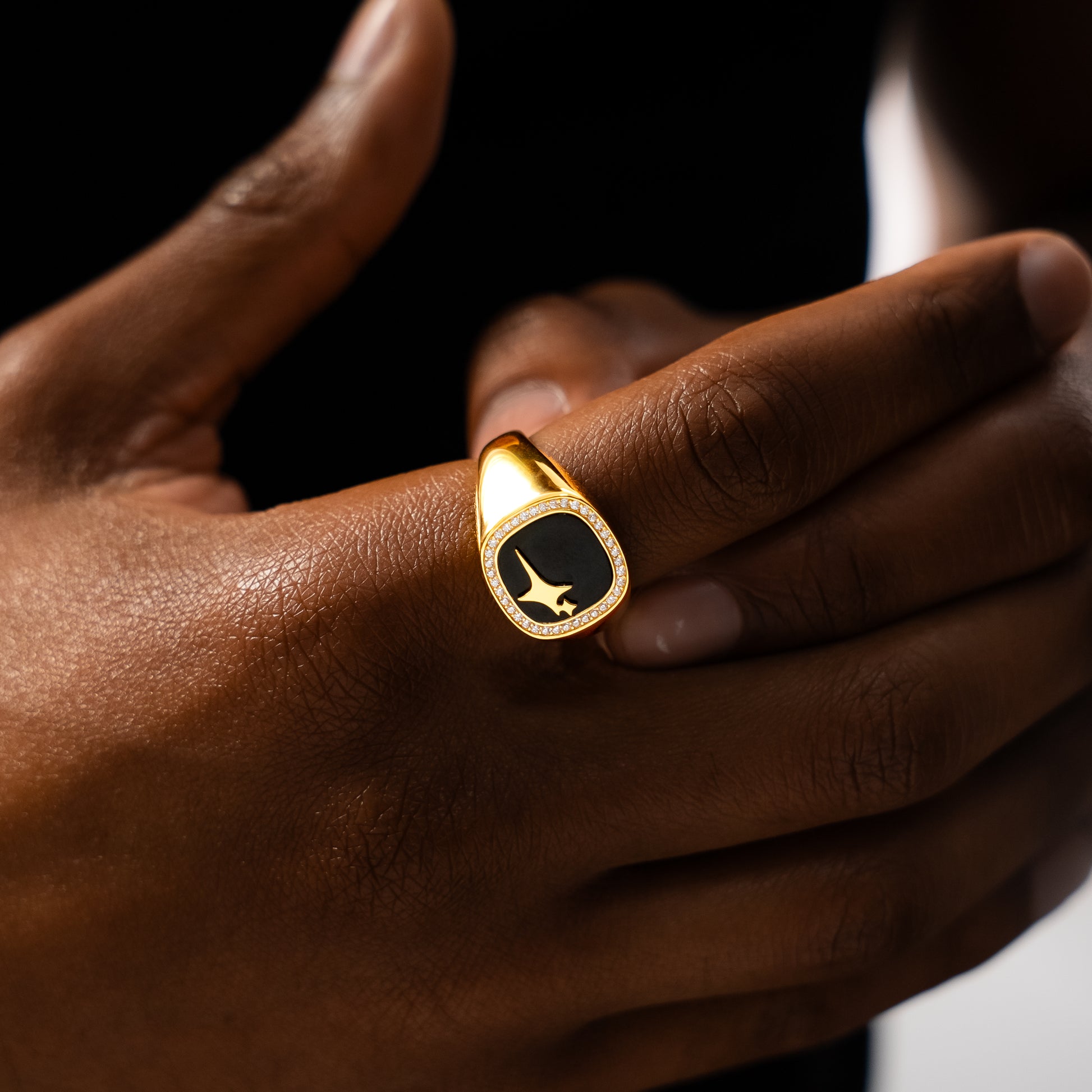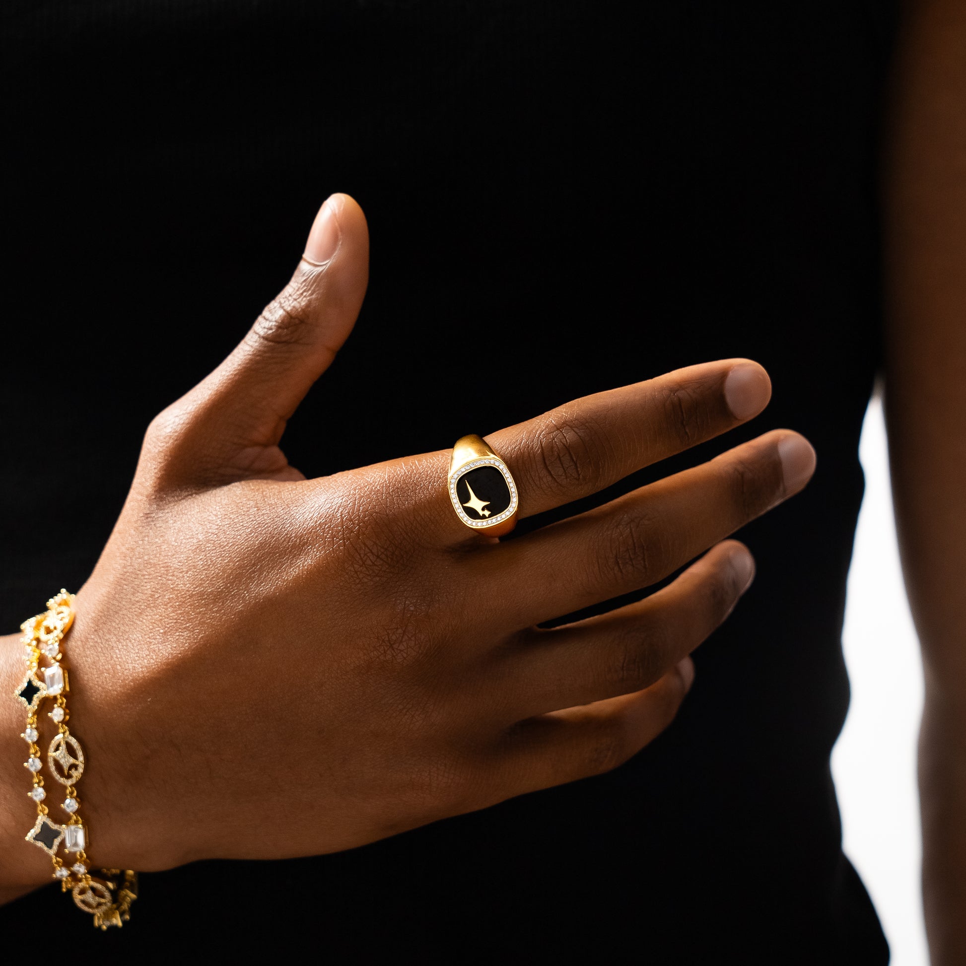 Discover our Raw Ring , a signet ring with a bold and refined design, highlighted by a large 15 mm square plate. Its center, adorned with an imitation onyx stone, contrasts delicately with the embossed Make it Shine logo. The whole is delicately encircled with white zirconium oxides, bringing a discreet but sophisticated touch of sparkle.