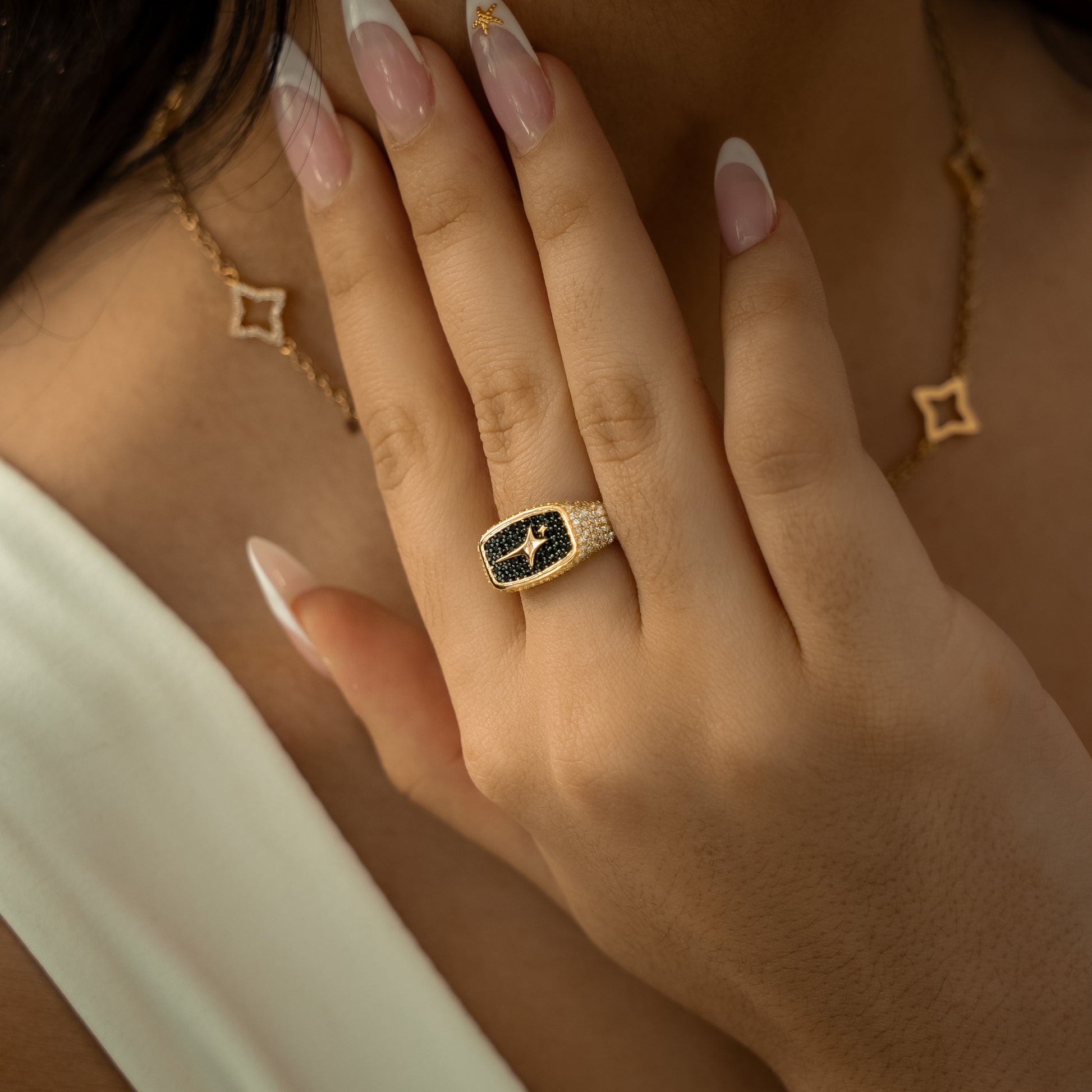Discover our Iced Rectangle signet ring with a 9mm thick rectangular base. Featuring our iconic logo, accompanied by black and white cubic zirconia stones, this ring combines sophistication and sparkle for a bold style.