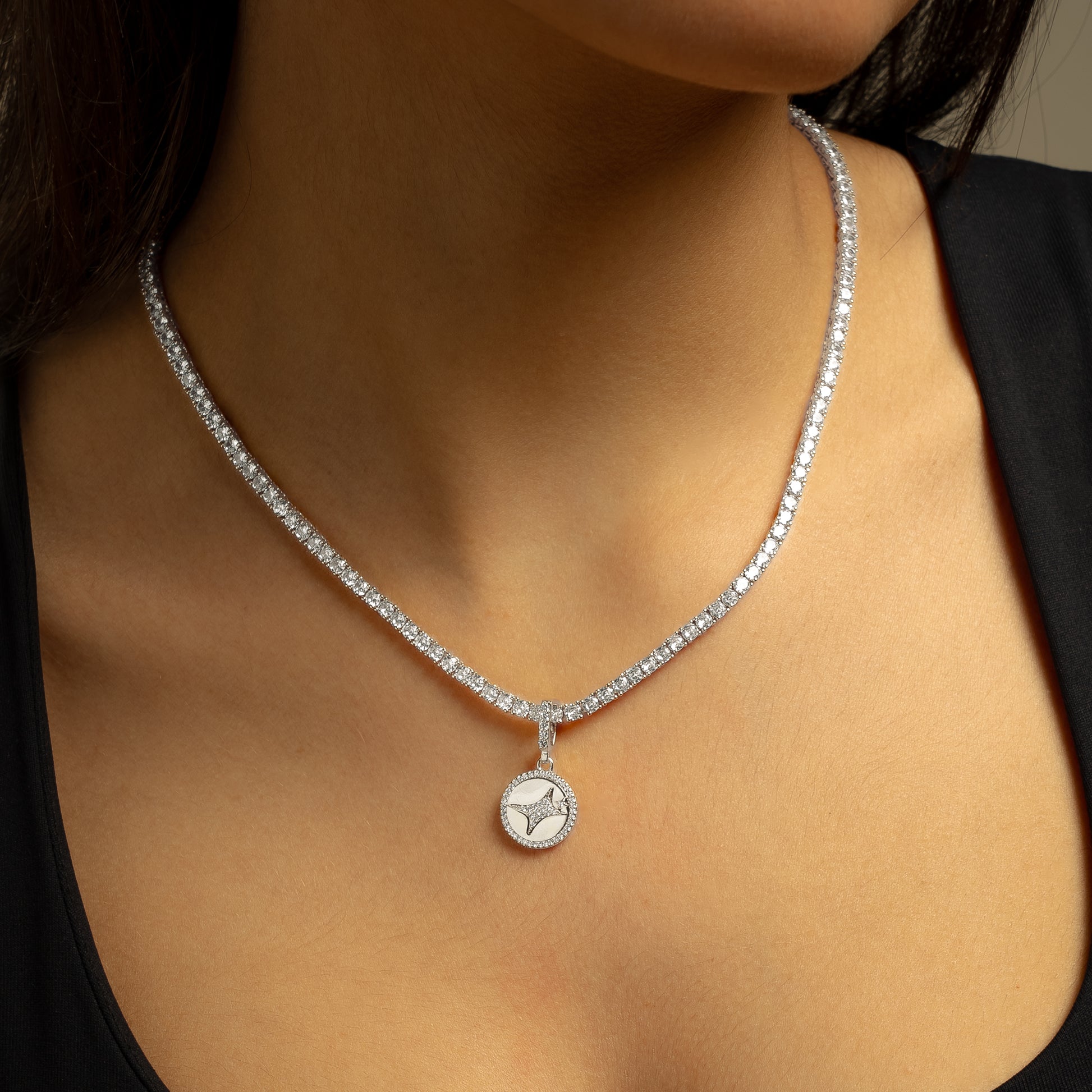 Discover our Signature Medallion, a radiant piece of jewelry that enhances our iconic star logo. With a diameter of 1.5 cm, this refined pendant is adorned with sparkling cubic zirconia, highlighting our central star. Perfect for adding a touch of sophistication and brilliance to your outfits.