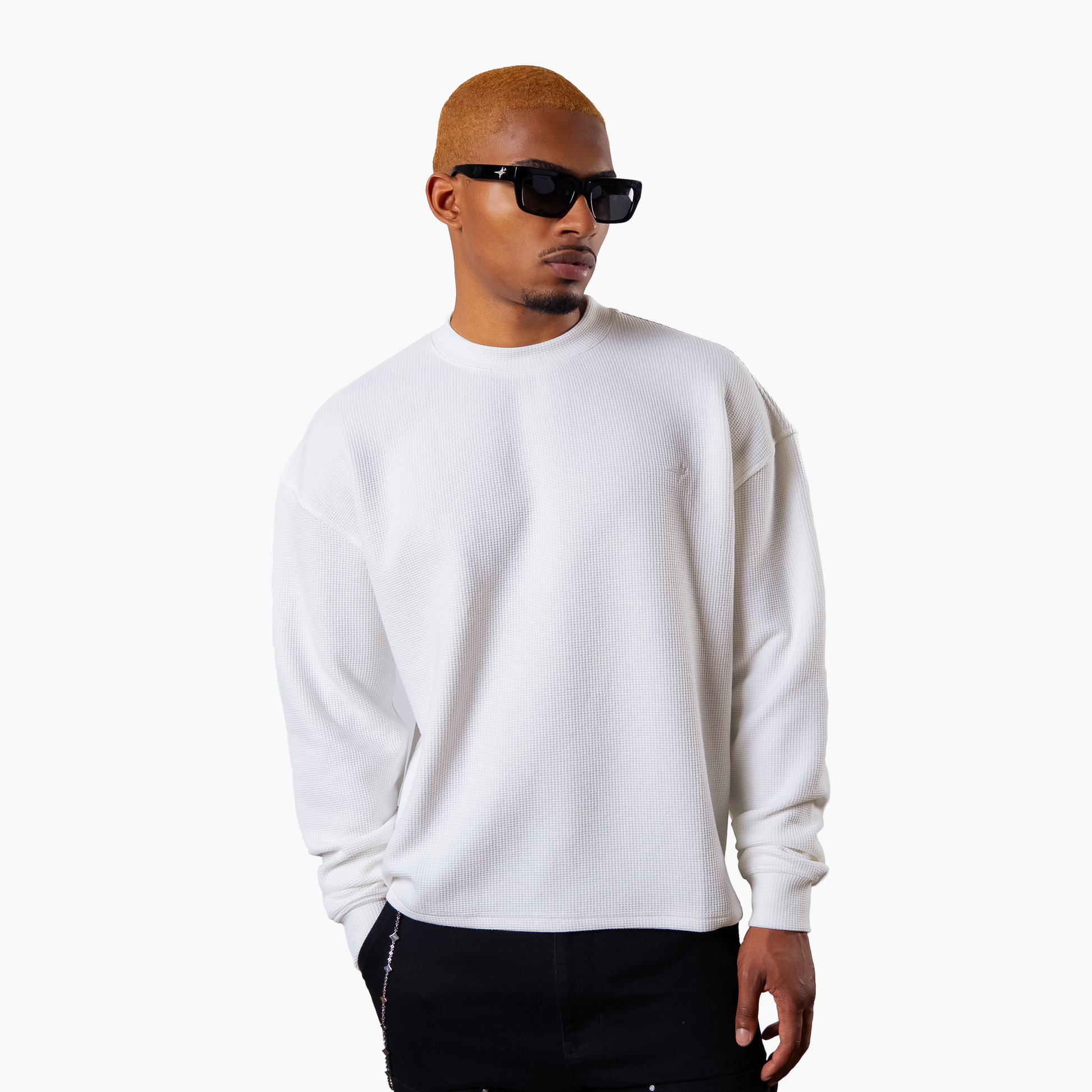 Off-white long-sleeved Waffle Sweater with an oversized, boxy fit, made from premium heavyweight cotton. Cinched cuffs. Crew neck.